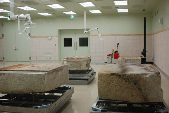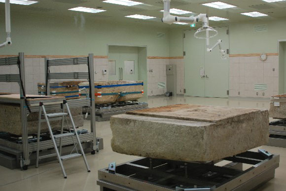 国宝高松塚古墳壁画を恒久保存するために、文化庁は①【石室解体工程】、②【壁画の修理及び保存処理工程】、③【恒久保存工程】に区分され、対応されています。2007年8月21日には工程①の石室解体が無事完了し壁画(石)は事前に完成した修理施設に運ばれ、工程②に移っています。
