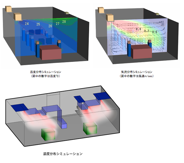 オフィスなどの一般空調やクリーンルームなどの特殊空調での空気性状(温度、風速、風向、濃度)を解析して可視化し、適正な空調を提案します。