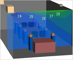 3次元の気流シミュレーションにより、気流及び温度分布を把握して、設備の省力化や滞留の防止など、よりよい室内環境を目指します。