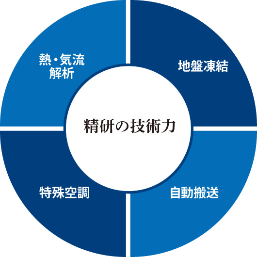 地盤を人工的に凍結させ凍土を造成します。当社は地盤凍結工法のパイオニアとして50年以上の研究・設計・施工の実績があります。加えて、凍土の完全遮水性と確実な品質管理により、大深度・大断面での掘削を可能にします。