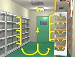 飼育室内の気流を一方向に制御することで、清浄な室内環境と良好な飼育環境を両立します。気流は一方向に制御され、飼育ラック内からの逆流がないため、臭気・アレルギー物質のない清浄な室内環境を維持します。飼育ラック内には、各段各列に均等に給気されるため、均一な飼育環境を実現します。